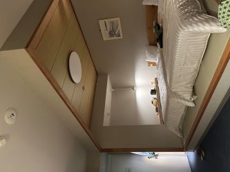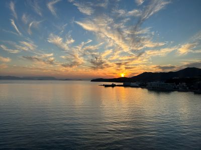 我々は翌日の干潮で渡る予定なので無理をしない。 古いホテルのようだが、改装されていて今風なインテリアになっていた。 広い洋室の中に少し床が高くなっている四畳くらいの畳スペースがあって、 ツインベッドが置いてある。そのベッドスペースの真上にシーリングライトがあった。 これを点けようとスイッチを探したが、どのスイッチを押してもハズレなので、 フロントに電話して尋ねた。すると「ベッドの上にある丸いものは照明ではありません。 インテリアでございます」と言われてのけぞる。 丸くて白くて天井にぴったりついてて、シーリングライトにしか見えない・・・。 ベッドサイドなどに別のライトはあるものの、 部屋のメイン照明だと思ったものが「インテリアでございます」だったので困惑。 ちょっと暗いまま「二十四の瞳」の続きを読んだ。 この部屋から見た瀬戸の夕陽が素晴らしかった。